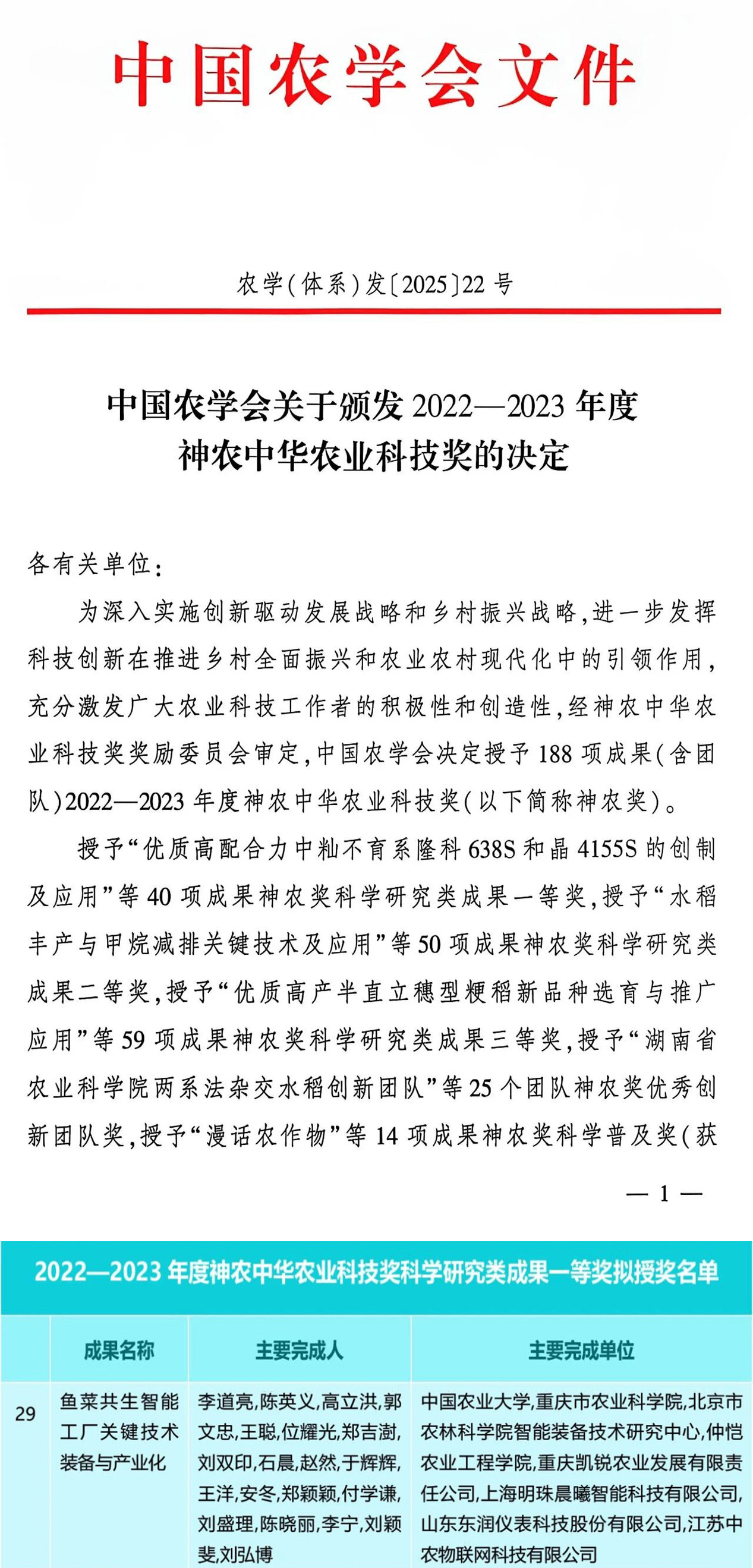 近日,2022-2023年度神农中华农业科技奖获奖名单正式发布,上海明珠晨曦公司“鱼菜共生智能工厂关键技术装备与产业化”荣获神农奖一等奖。